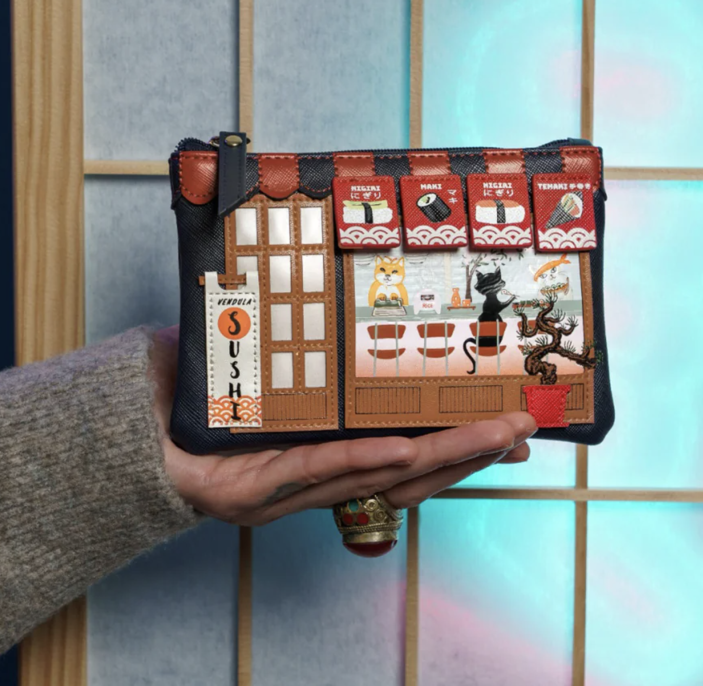 Zip it up with flair! The Vendula Sushi – Blue Edition Zipper Coin Purse is a must-have mini with major personality. Designed in vegan leather and featuring a sushi restaurant-themed artwork with vivid prints and appliqué, it includes a spacious compartment for coins and cards plus a keychain for convenience. Whether linked to your keys or clipped onto your bag, it’s a joyful everyday companion.